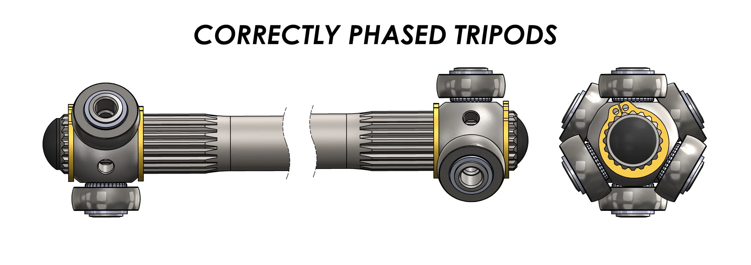 It’s good practice to phase the tripod joints on your axle to minimize vibrations and smooth out torque delivery. When you look at the end of your axle the two tripods should be clocked 60° from each other.