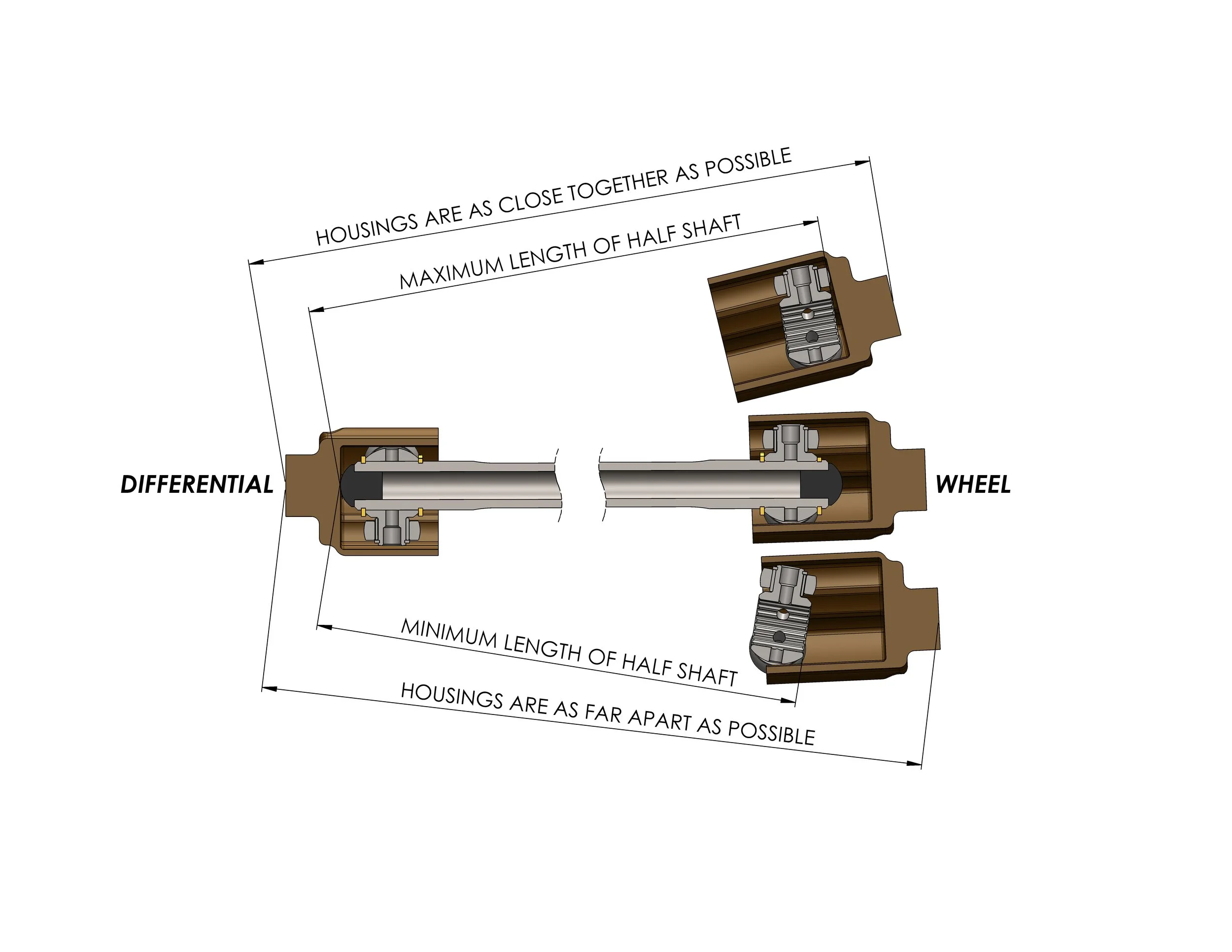 In the diagram below, the minimum length of the halfshaft is defined when the housings are as far apart as possible. One tripod joint is bottomed out in its housing and the other joint cannot come out of its housing. The maximum length of the halfshaft is when the housings are as close as possible and both tripod joints will not bottom out in their housings.