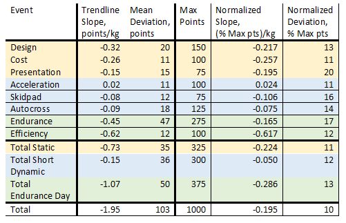 Table 1 shows that static event points – Design, Cost, and Presentation events - are a little more strongly influenced by mass than total points are (as demonstrated by the total static normalized slope). In Design, one might at first imagine that this reflects a judging bias towards lighter racecars; although it is surely more accurate to conclude that racecars which have been carefully designed to reduce mass have also been carefully designed in other judge-able ways. Low mass might then be taken as a symptom of high-scoring design instead of as a cause. The same premise might hold for Presentation – a better prepared team tends to design better (i.e. lighter) and also presents more effectively. In Cost, we might additionally observe that lighter cars have a lower material cost.