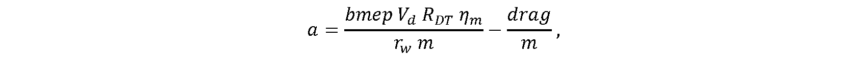 where a is longitudinal acceleration, bmep is engine brake mean effective pressure and V_d is engine displacement (or the electrical powertrain equivalents to bmep and V_d that parameterize shaft torque), R_DT is the total powertrain/drivetrain reduction ratio, n_m is its efficiency, r_w is the rolling wheel radius, drag force includes shaft, aerodynamic, and other frictional items, and m is our friend, total vehicle mass (with driver, this time). Many of these parameters vary with racecar speed. Acceleration is further limited by suspension and tire characteristics in a manner that is less linear, but certainly as important.