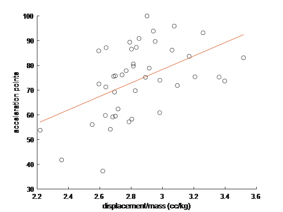 From the physical view, mass matters to FSAE/FS longitudinal acceleration performance, but only as a dependent parameter - as a part of the thrust-to-weight ratio (coupled through speed to the power-to-weight ratio). The results reported by FSAE do not support calculation of this ratio for the competition field - bmep, R_DT, n_m, r_w, and drag are not available. But V_d is. And if some scatter in bmep and drivetrain parameters is accepted, then V_d/m (going back to curb mass) might serve as a proxy for a whole-vehicle thrust-to-weight ratio. Plotting Acceleration points against V_d/m shows: