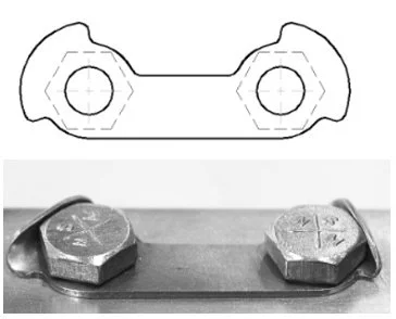 Cotter / split pins and lock plates that mate with a side of the fastener hex are rule abiding positive locking features. However keep in mind the important benefits of clamp load noted previously in this chapter. Standard castellated nuts and traditional locking tab plates are set up to engage a hex every 60 degrees. 60 degree increments are much too course to control the torque and clamp load on a fastener. If you are going to use these features and expect to control clamp load, then you need to get creative and provide a locking feature that mates to the torqued fastener position and not have the fastener angular position set by the locking feature. Figures #30, 31, and 32, show examples of positive locking features. Figure #32 shows a locking plate with tabs that wrap around the bolt head more than a single flat of the hex. This allows the locking tab to be bent up at whatever position the tightened bolt head ends up.