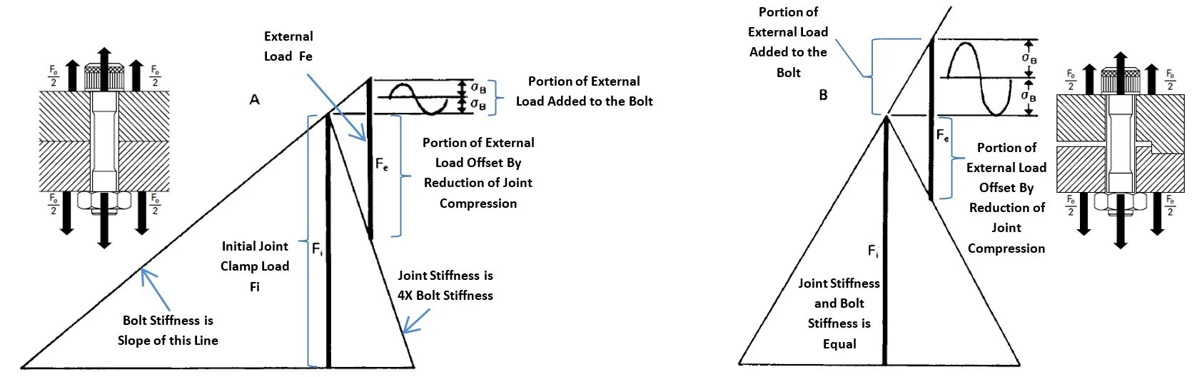 Figure #12 Diagram A has a joint to bolt stiffness of 4:1. The bolt only sees a small portion of the external load. Most of the external load is reacted by reduced compressive load in the joint instead of added tensile load on the fastener.