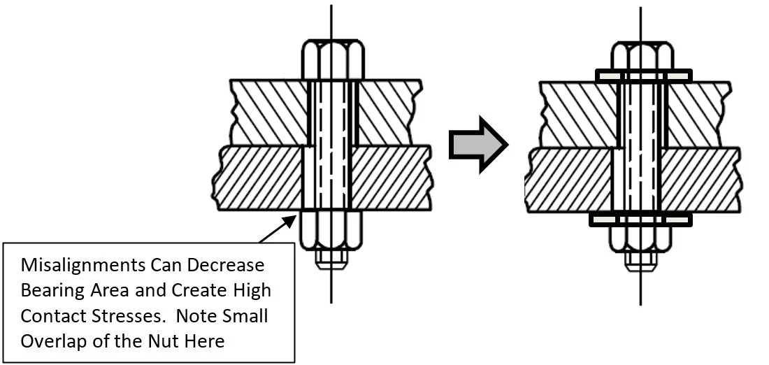 FIGURE #17 – EXAMPLE OF HOW PART ALIGNMENT CAN REDUCE THE LOCAL BEARING AREA AND HOW WASHERS CAN BE USED TO INCREASE THE BEARING AREA OF THE JOINT. SOURCE - FORD FASTENER HANDBOOK